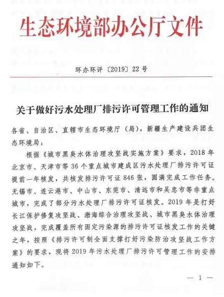 近日,生態(tài)環(huán)境部發(fā)布《關于做好污水處理廠排污許可管理工作的通知》,對2019年污水處理廠排污許可工作作出通知。詳情如下: