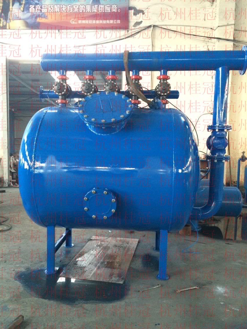 當系統處于反洗狀態時,過濾仍然繼續,其中要進行反洗的標準單元砂缸不進行過濾,系統中其它標準單元砂缸仍然在過濾。過濾后的清潔水部分用來反洗標準單元砂缸,其余仍送到用戶處。反沖洗污水則通過水力閥的反洗排水口被排出。在高速砂缸全自動高效過濾系統中,特殊的集水器設計可使填料之間填料相互搓洗,最大限度地提高反沖洗效率,減少所需的反洗水(清潔水),同時反洗時沒有跑料現象。一個標準單元砂缸反洗為2分鐘,反沖洗結束,標準單元砂缸內部壓頭損失減小到合理范圍,定壓裝置給出復原信號,水力閥恢復到過濾狀態,下一個標準單元砂缸則準備進入反洗狀態。