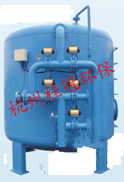 全自動多介質過濾器(又稱機械過濾器)是以成層狀的無煙煤、砂、細碎的石榴石或其他材料為床層,床的頂層由最輕和最粗品級的材料組成,而最重和最細品級的材料放在床的低部。其原理為按深度過濾--水中較大的顆粒在頂層被去除,較小的顆粒在過濾器介質的較深處被去除。從而使水質達到粗過濾后的標準。