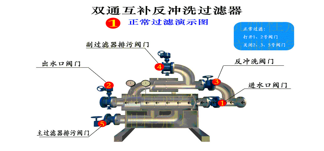 關閉三號反沖洗閥門,四號副過濾器排污閥門,五號主過濾器排污閥門;水由一號進水口閥門流經主過濾器過濾再由二號出水口閥門至可用水接入點,正常過濾完成。