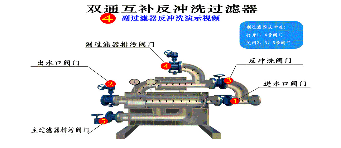 水由進水口閥門進入主過濾器過濾,反方向進入副過濾器對濾芯進行反沖洗,污水由副過濾器排污閥門排出;副過濾器反沖洗完成;