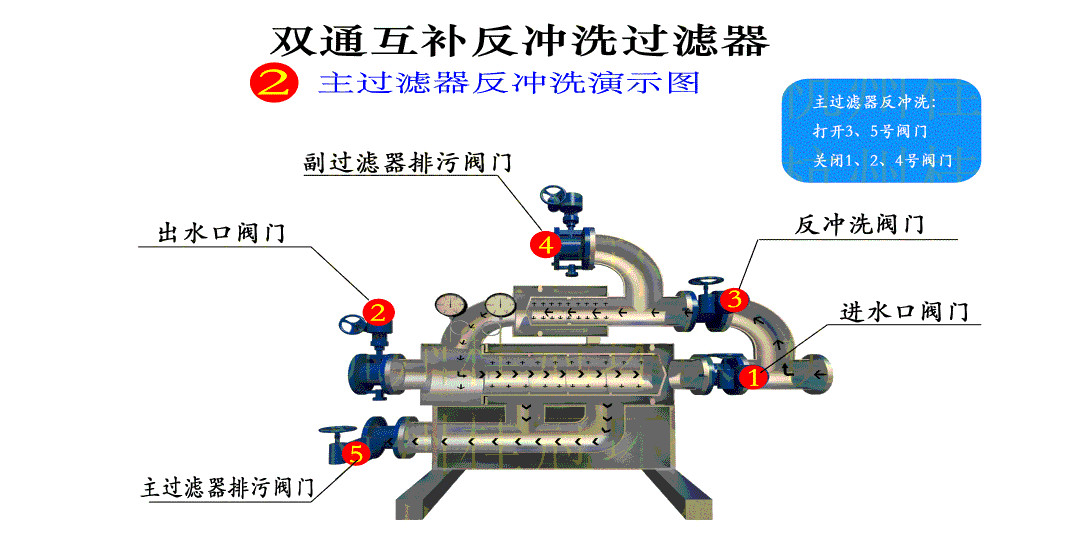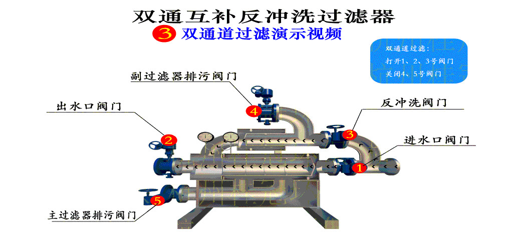 原水有接入點分別流經一號進水口閥門,三號反沖洗閥門,至主過濾器管道及副過濾器管道分別過濾,并由二號出水口閥門流出;雙通道過濾完成;