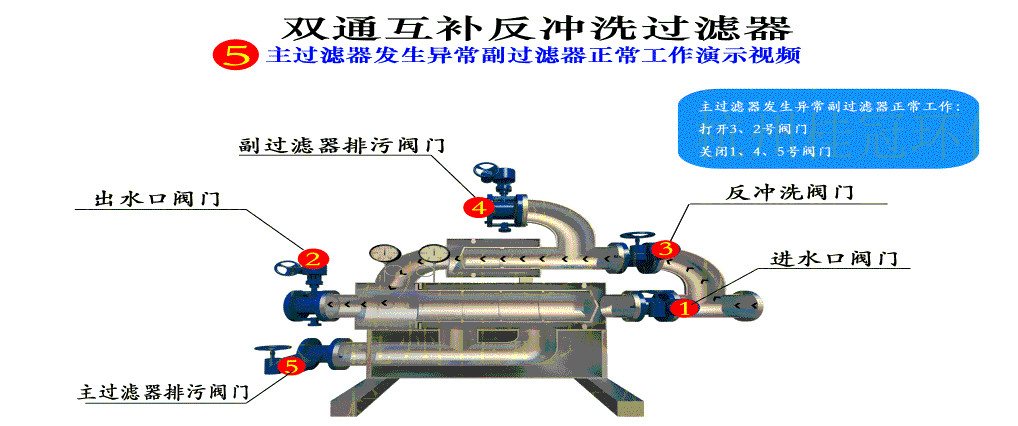 2、主過濾器反清洗:打開三號反沖洗閥門,五號主過濾器排污閥門;關閉一號進水口閥門;四號副過濾器排污閥門,二號出水口閥門;