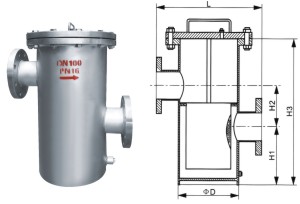 高低籃式過濾器主要由進口的接管和法蘭、筒體、濾籃、筒體法蘭、筒體法蘭蓋及緊固件組成。當液體通過進口進入筒體流經(jīng)濾籃后,固體雜質(zhì)顆粒被阻擋在濾籃內(nèi),而潔凈的流體通過濾籃,由過濾器出口流出。當需要清洗時,打開底部排污口,排凈流體,拆卸筒體法蘭蓋,清洗后重新裝入即可。